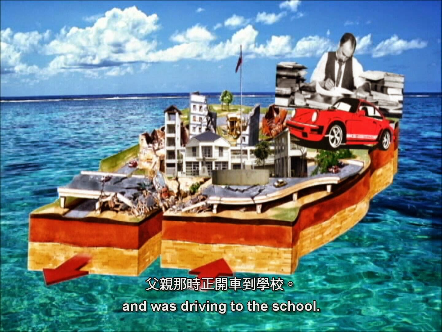我將文本拆解,將信中的關鍵詞利用Google搜尋出對應的圖片,再將每個搜尋後選出的圖片製成元件,編排成一部不同原文本敘事的影片,同時用Google翻譯器的朗讀功能將信語音化。試圖使觀者在看到影片時透過電子口述(一封描述災難現場的情境書寫)與影像(經由關鍵字對位的隨機圖像),在聽覺與視覺的即時理解產生對事件的想像空間。